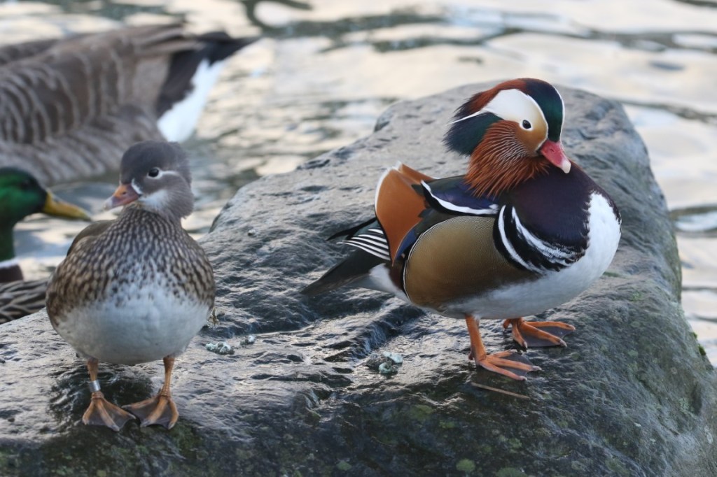 Photo: Pair of Mandarins at Bowness, Windermere, note the female has a BTO metal ring! (c) Andrew Chick