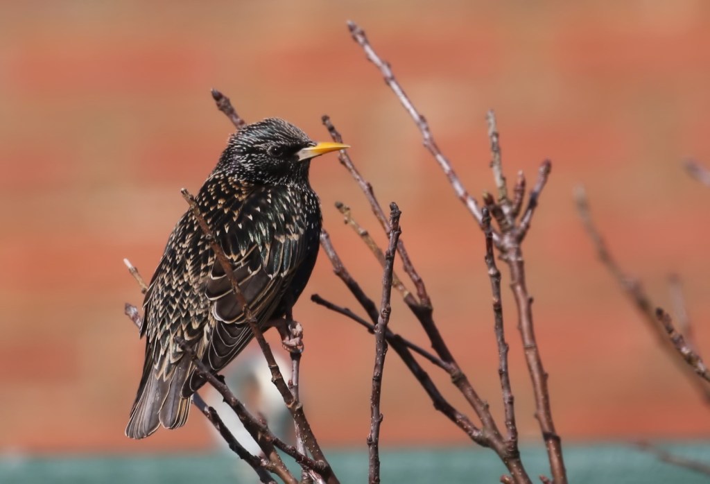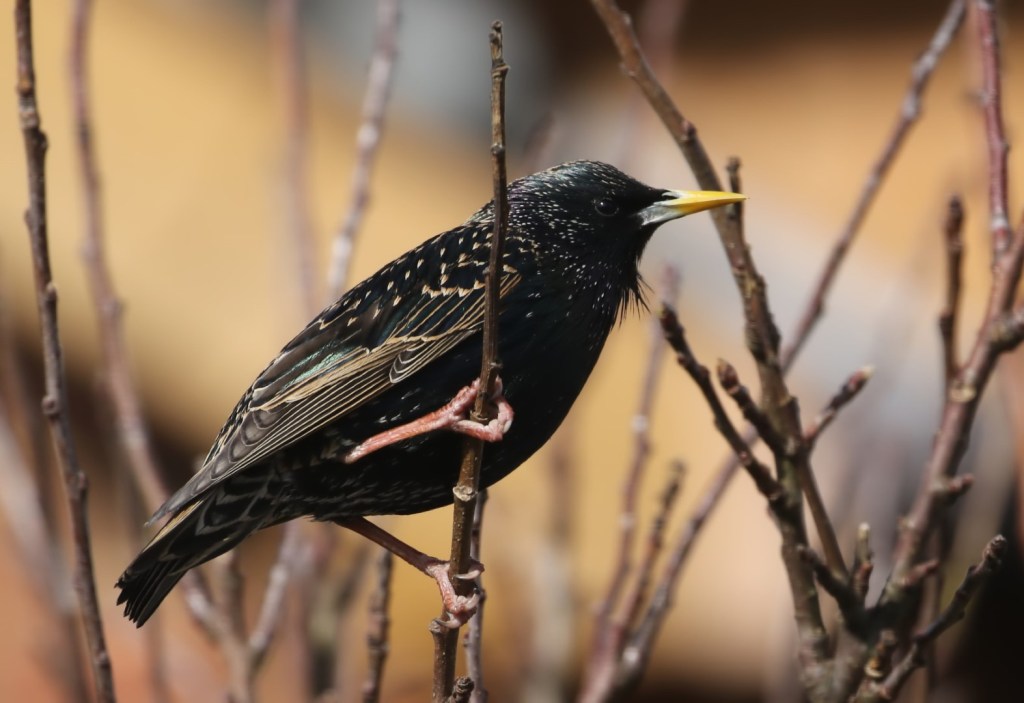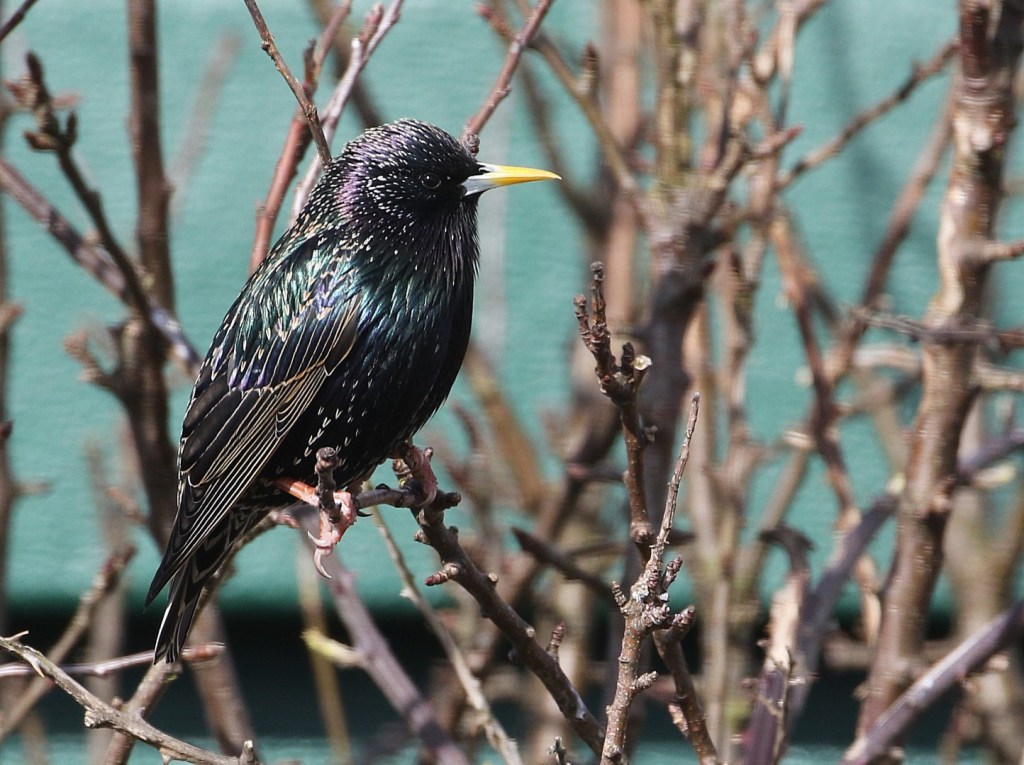 The common starling (Sturnus vulgaris) has striking iridescent plumage that appears black at a distance but shimmers with purple, green, and blue hues in the light. In summer, their feathers are sleek and glossy, while in winter, they develop pale speckles across their body. Their pointed yellow bill in the breeding season contrasts with the darker, blackish bill of non-breeding birds.