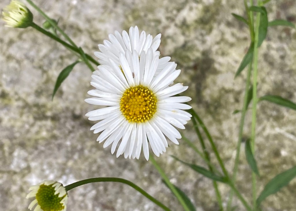 Mexican Fleabane (Erigeron karvinskianus) is a daisy-like plant originally native to Mexico and Central America but now widely naturalised in parts of the UK, particularly in the south and west. Introduced as a garden ornamental, it has escaped cultivation and is increasingly seen thriving in cracks in old walls, pavements, and coastal stonework, where its trailing habit and abundant pink-tinged white flowers create a distinctive display from late spring into autumn. Favouring warm, well-drained niches, it is especially common in historic towns and coastal settlements such as Cornwall and parts of Wales. Although not native, it is not generally considered invasive and often adds character to urban and semi-natural habitats, where it attracts bees and other pollinators.