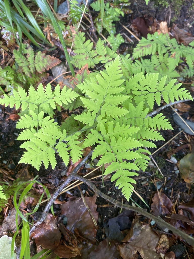 Oak fern (Gymnocarpium dryopteris) is a delicate, deciduous fern with light green, triangular fronds that resemble miniature bracken. It typically grows to around 20–30 cm tall and spreads by slender creeping rhizomes, often forming small, loose colonies.