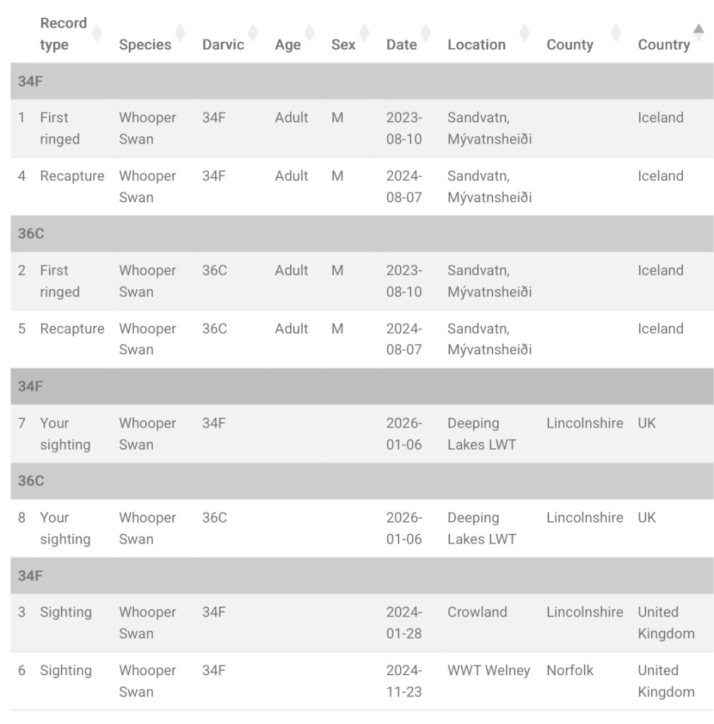 I recently visited Deeping Lakes LWT in Lincolnshire. With much of the water frozen, many of the c.150 Whooper Swans present were standing on ‘thin’ ice. Two individuals were noted carrying white darvic rings with black lettering: 34F and 36C. Both birds were originally ringed at Sandvatn, Mývatnsheiði, Iceland on 10/08/23, and were subsequently recaptured at the same site on 07/08/24. Today’s sighting represents the first resighting of 36C since 2024, while 34F has previously been recorded at Crowland (28/01/24) and Welney WWT (23/11/24).